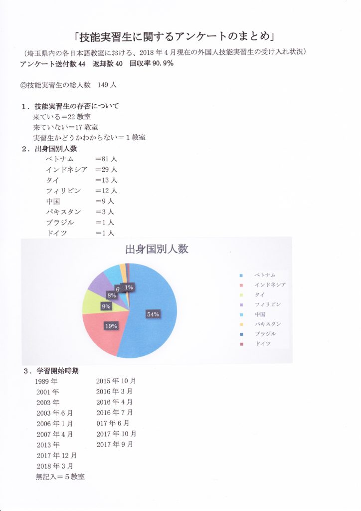 埼玉日本語ネットワーク(代表山尾三枝子)では、近年、受け入れが増加している外国人技能実習生が、埼玉県の日本語教室にも来ることが多くなり、その実態を把握するため、同ネットワーク参加の県内日本語教室よりアンケート調査を行いました。